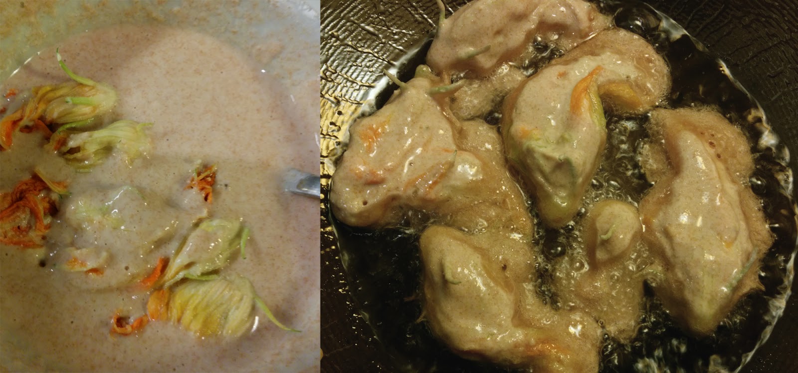 Heat about a 1/4 inch of rice oil (or another oil that works well at higher temperatures) at medium-high heat for a few minutes. Meanwhile, immerse the whole stuffed blossoms into the batter, a few at a time, lift them one-by-one, and drop them into the heated oil, being careful not to splash.
